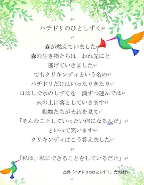 青木クリニックスタッフは、表現の上手・下手はあれども、皆一生懸命に小児科のお仕事をがんばり、子ども達が大好きです。私もハチドリになれるように、精一杯頑張ります。