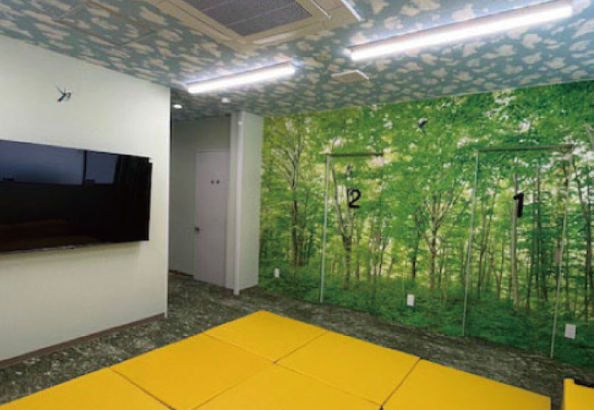 壁には、森を意識して、沖縄クヌギ林の画像をはりつけています。