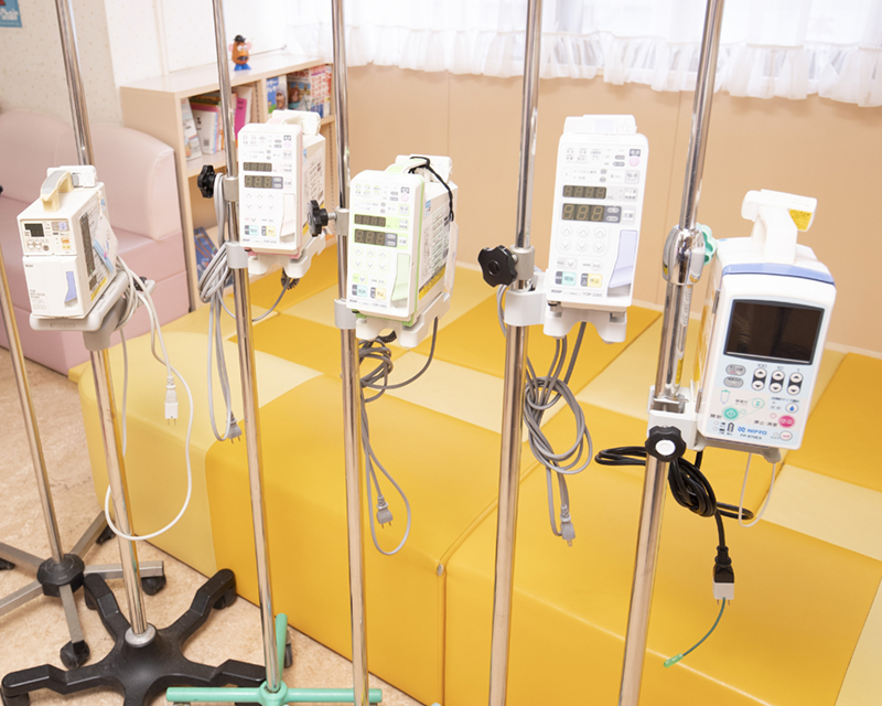 小さいお子様の輸液は、正確な量やスピード、そして体が動いても大丈夫なことが求められます。輸液ポンプを使用し、安全に輸液管理を行っています。